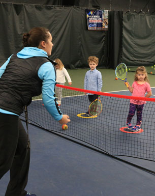 From 4 years old: They will be instructed using shorter racquets (17 to 19 inches), playing on smaller area (26 feet) with no net and using big 10 inch inflatable balls.
